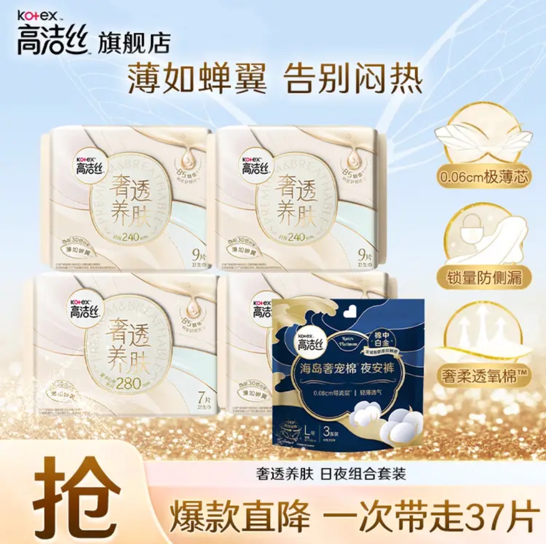 高洁丝(Kotex)卫生巾 升级B5奢透养肤日用夜用0.06蝉翼极薄透气姨妈巾 日夜37片(240*27+280*7+L3)